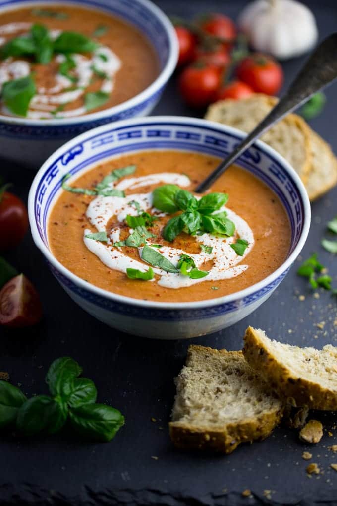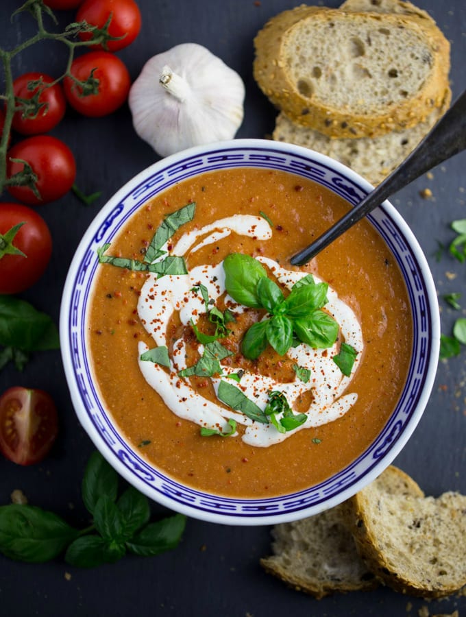 - Season the soup with salt, pepper, and red pepper flakes and cook for about 3 minutes. Top it with cashew or soy cream, more chopped basil, and red pepper flakes. Serve with fresh bread or vegan cheese sandwiches.