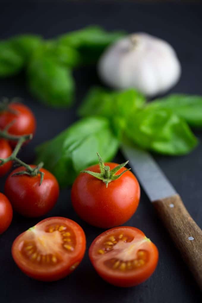 - Heat the olive oil and sauté the onion and the garlic for about 2-3 minutes. Then add the tomatoes and the basil. Cook for a minute. Transfer to a blender, add the cashews and the nutritional yeast, and blend until smooth.