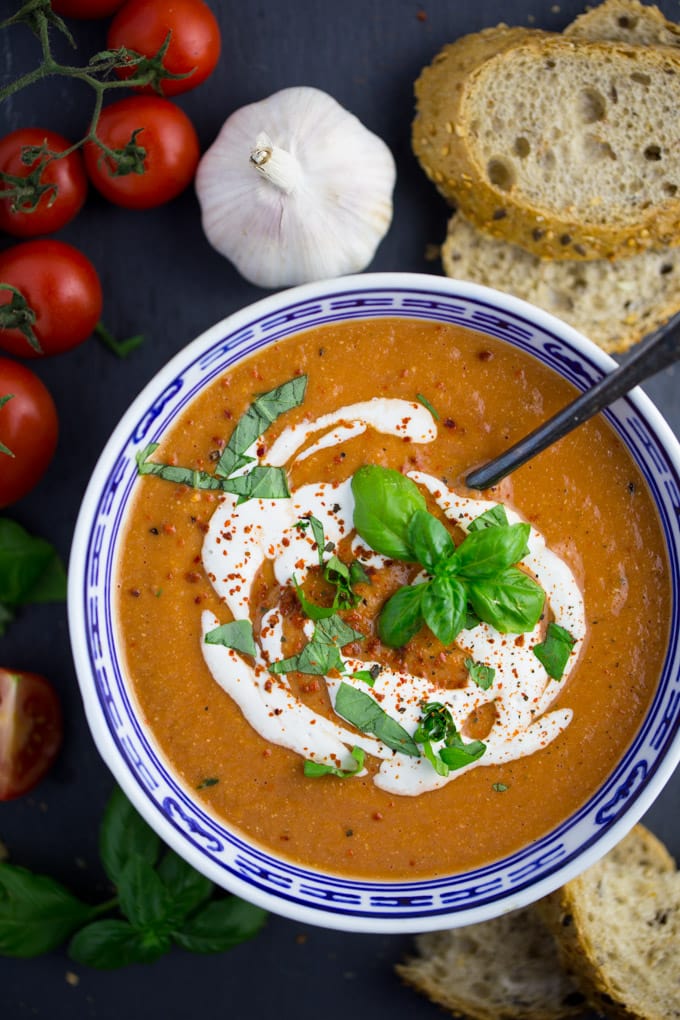 I’m super busy at the moment because I’m having my final master’s exam next week. I can’t believe I’ll finally be done with university. Yaaaay! So I was looking for some really simple recipes to make this week. And this vegan tomato basil soup was just perfect. It’s super easy to make, incredibly creamy, and so comforting! It gets its creamy texture from cashews and nutritional yeast. The perfect meal for lazy or busy days!
