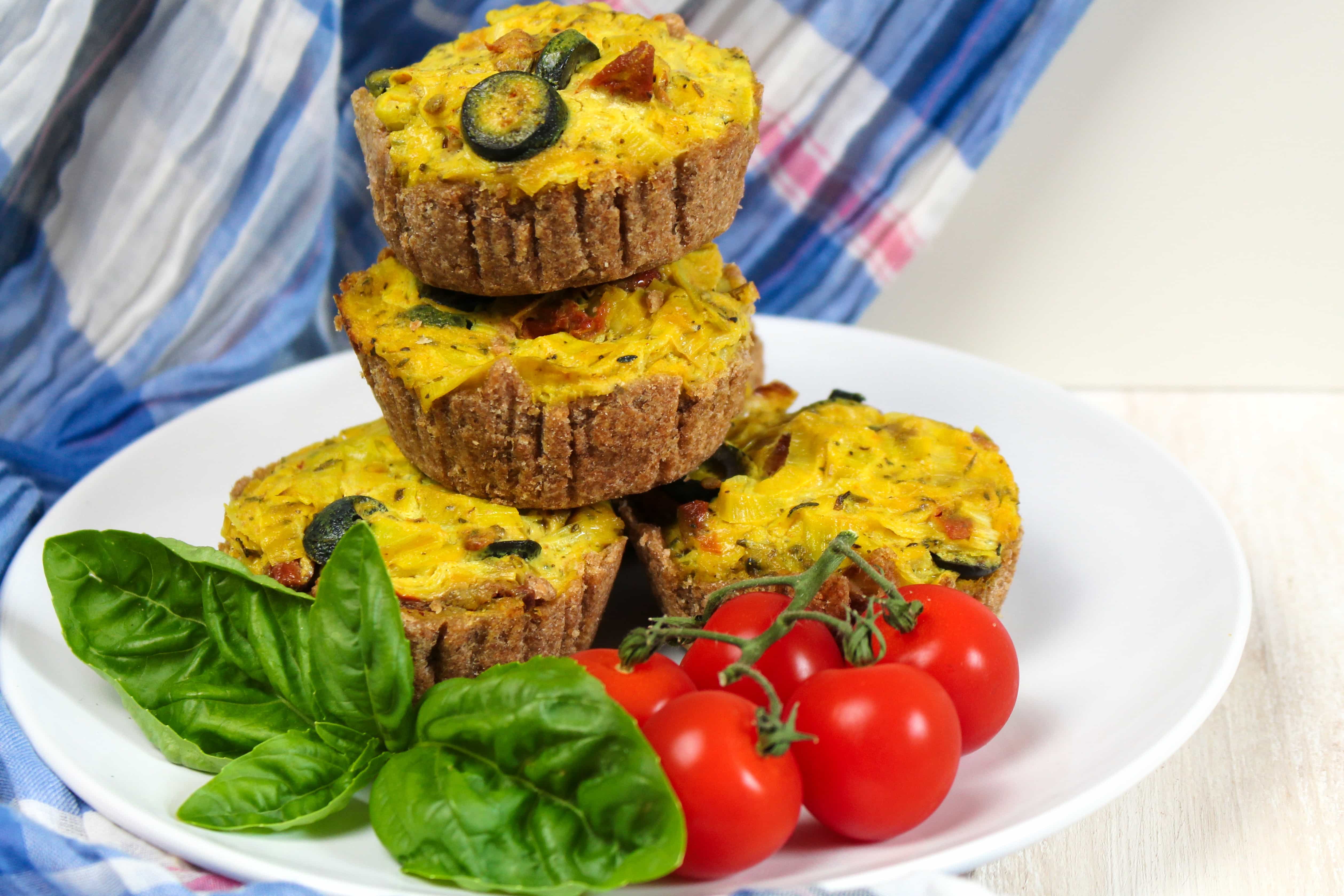 - Divide the dough into twelve portions and place twelve baking cups into a muffin tray. Evenly press the dough balls into the bottom and all the way up the sides of the muffin cups. Fill with the tofu-mixture and bake for 30-35 minutes at 180 °C (356 °F). Serve together with a green salad or as a snack. The mini quiches are also great when filled with mushrooms and spinach.